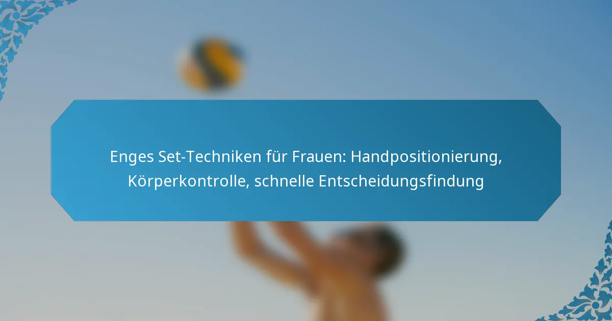 Enge Set-Techniken für Frauen im Volleyball beinhalten präzise Handpositionierung, starke Körperkontrolle und schnelles Entscheidungsvermögen. Das Beherrschen dieser Komponenten ermöglicht eine effektive Ballplatzierung, verbessert das offensive Spiel und die Teamkoordination.